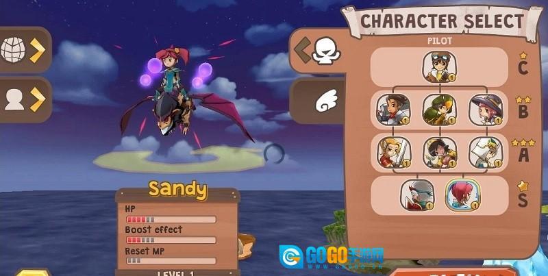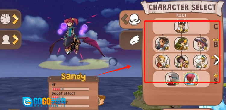 1、点击CHARACTER SELECT即可进入角色选择界面,在这里可以查看所有可供选择的角色。你可以按照C、B、S的等级顺序来筛选查看角色,其中Sandy是拥有紫色光翼的飞行员角色。