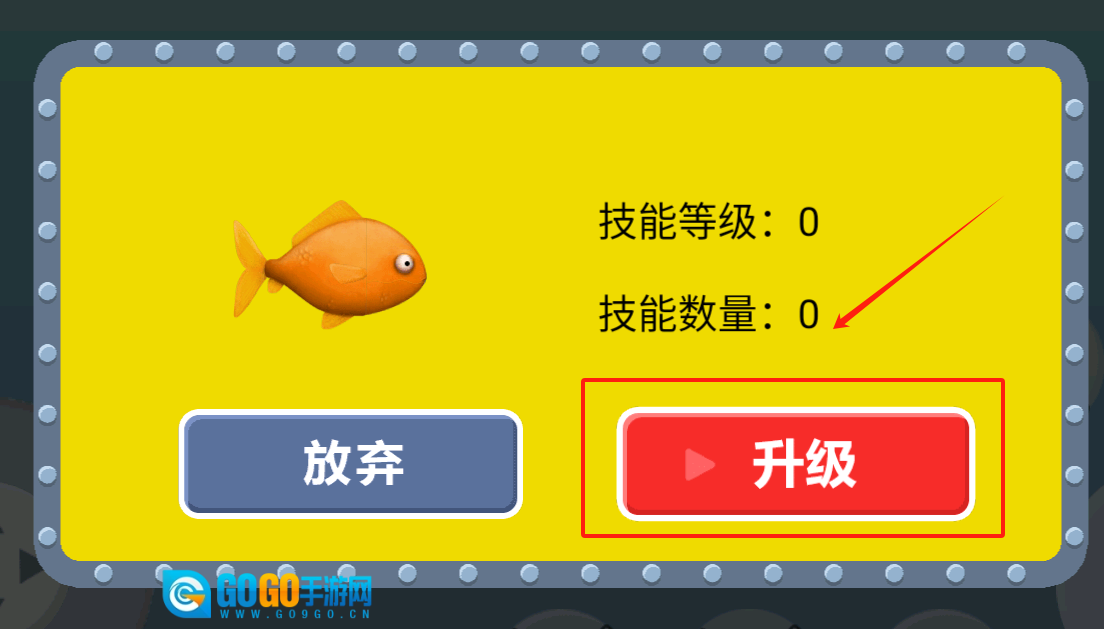 3、看黄色边框框里的橙色小鱼技能等级和数量,点升级提升,或者点放弃。