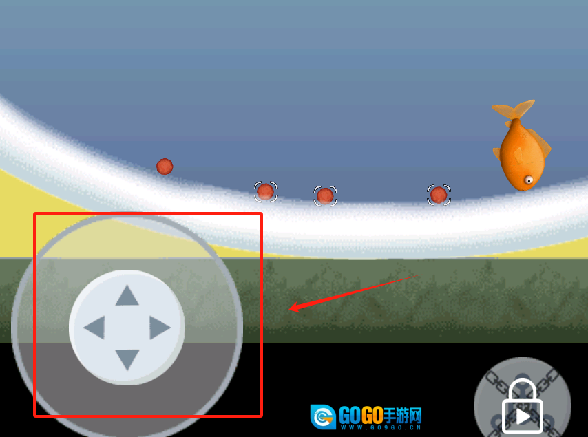 2、用带箭头的虚拟摇杆控制橙色小鱼移动,避开红色小球,远处有带锁区域。