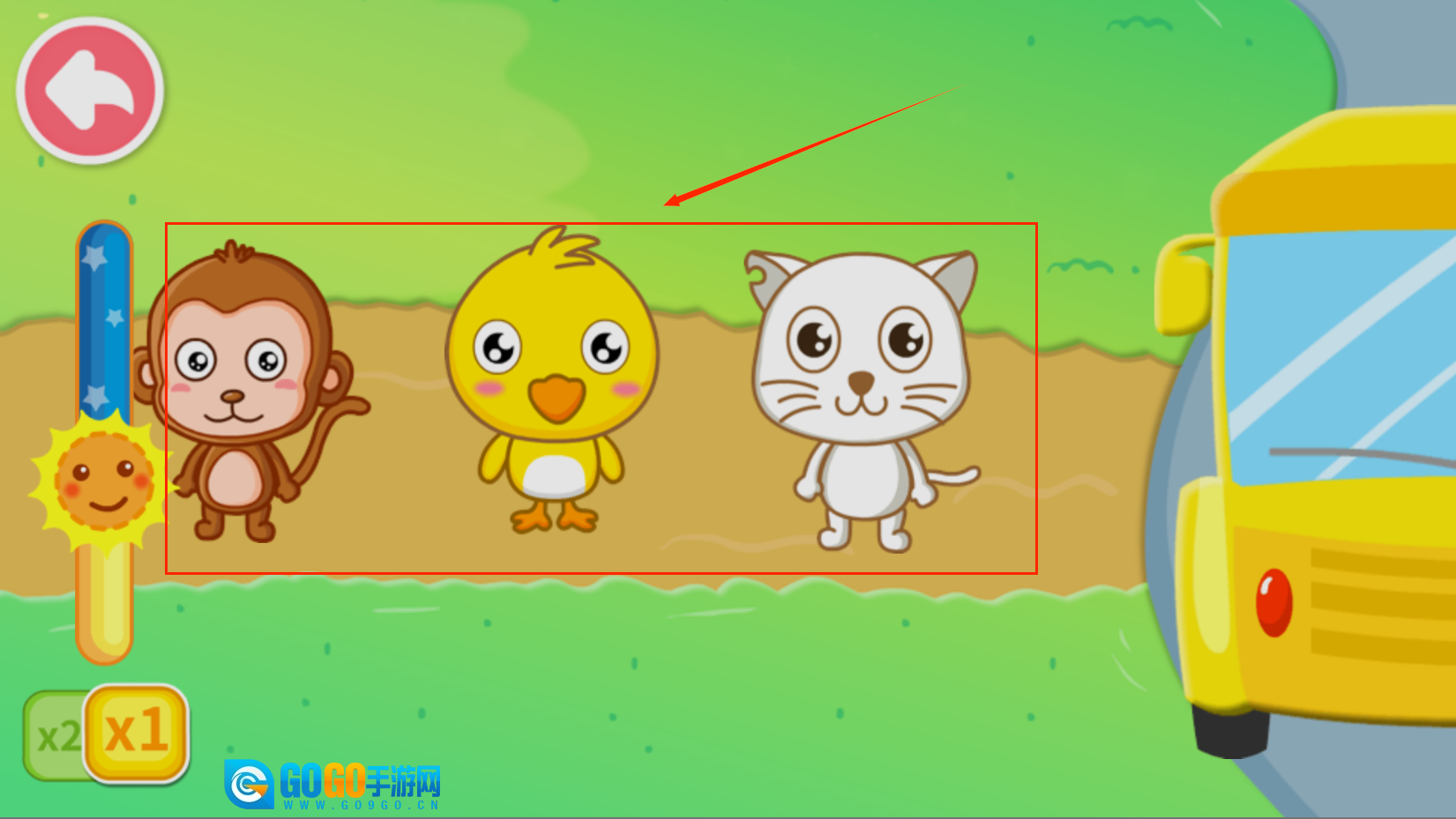 2、点击小车后,会看到有三个小动物站在那里,左边有一个类似电灯开关的东西。