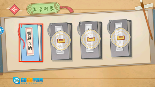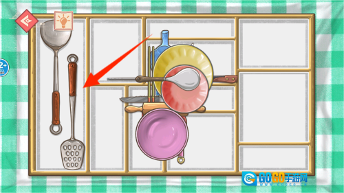 2、关卡加载完毕后,选中“餐具收纳”这一关卡,画面里会出现散落各处的刀叉、碗碟之类的厨房用品。