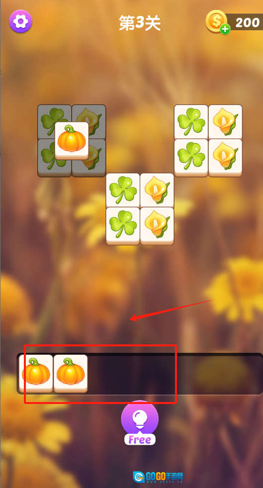 2、找出三个相同的图案并点击消除,达成关卡目标即可获取金币。