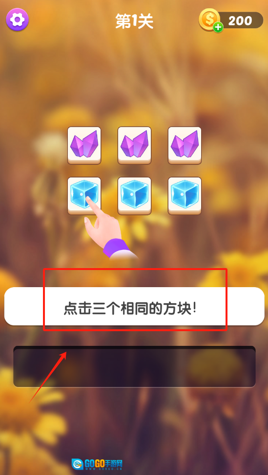 1、点击下方蓝色方块,消除相同图案,按照提示凑成三连即可过关。
