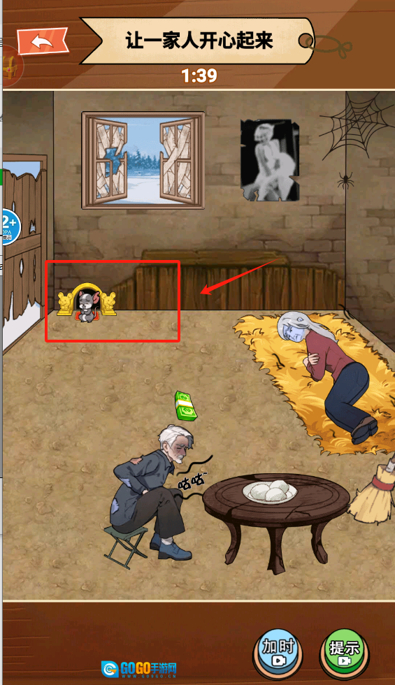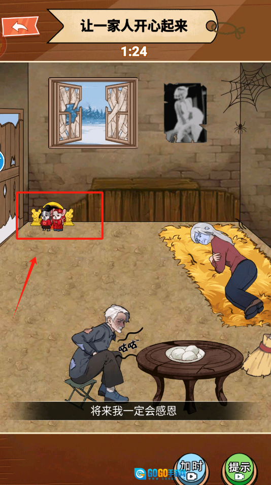 3、在1分24秒的倒计时内,通过尝试不同操作来让一家人开心,期间可以点击加时按钮或提示按钮。