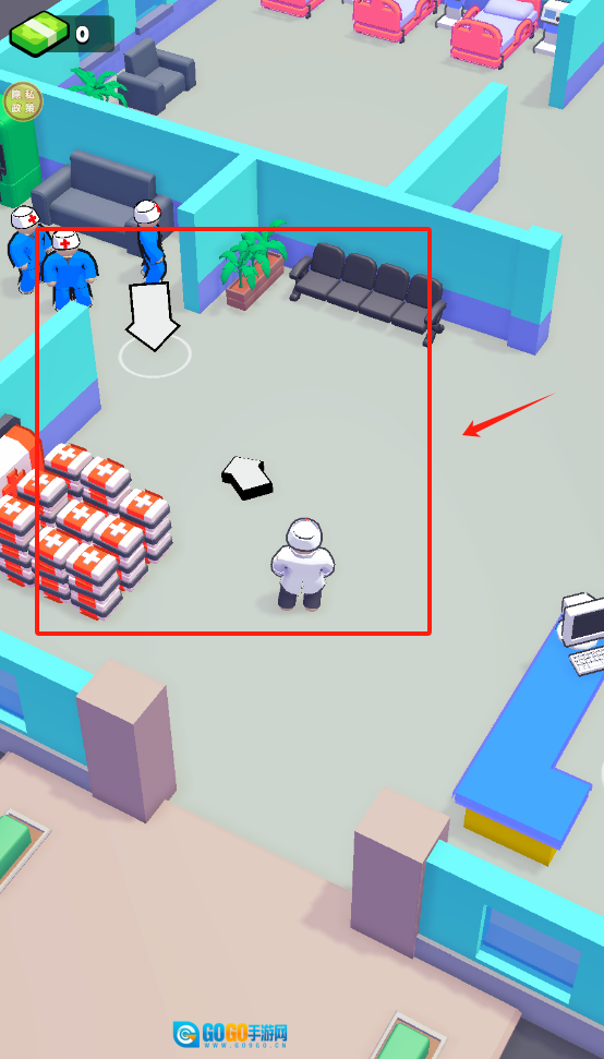 1、点击左侧红框内的白衣人员图标可查看患者信息,右侧的电脑设备则能用于管理医院日常事务及医疗物资。