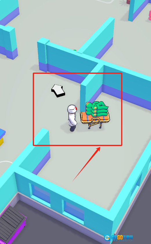 第3张图的操作步骤如下:点击推车上的绿色物品为患者进行治疗,同时需要将地面上的黑白衣物整理好并放回原位。