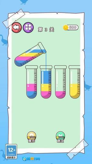 4、水排序关卡的核心在于对液体颜色进行区分,需依照颜色类别依次将液体倒入试管,防止因混合而致使任务失败。