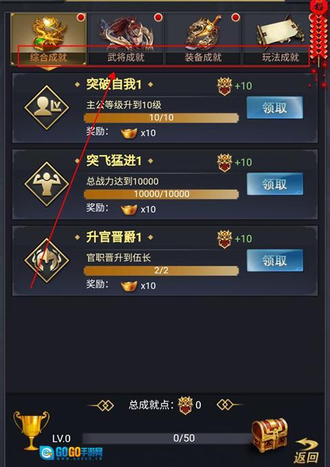 游戏内设有综合、武将、装备、玩法四大类成就,玩家每达成一项成就,都可领取元宝与成就点作为奖励;而积累的成就点能够用于提升成就等级,进而解锁对应的成就宝箱。