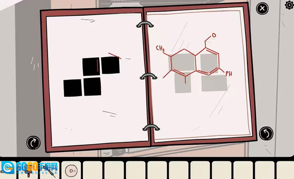 3、你可以拉开显微镜所在桌子的抽屉,里面放着一个手电筒和一张透明片,透明片上印着一个化学公式。你留意到这个公式里的红线,和笔记本中黑色方块上的线条是一样的。