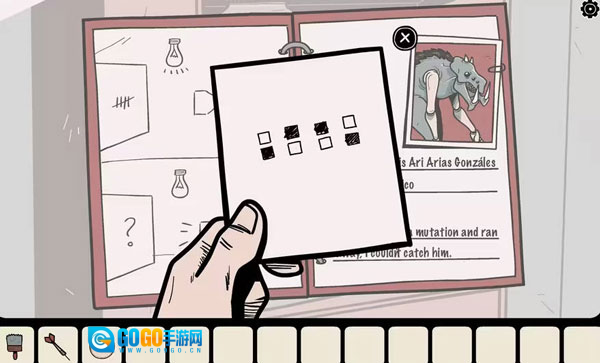 2、向右移动,你会看到衣柜上附着着一些令人恶心的东西,还有一扇锁住的牢房门。继续向右移动,你会发现一个实验台,墙上挂着不少照片,这些照片的排列方式和笔记本里黑色方块的排列方式是一样的,每张照片上都有一个奇怪的符号。
