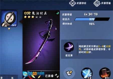 2、鬼泪村正 这是一把来自日本的太刀,在近距离砍杀时表现十分出色,而且还能对着远处的敌人挥出具有穿透效果的剑气来造成伤害。