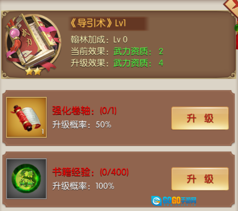书籍资质的升级途径有两种,一是使用强化卷轴,二是消耗书籍经验。强化卷轴需通过关卡概率掉落获取;书籍经验则可在书院和衙门论战中得到。强化卷轴的升级成功率与书籍星数相关,而书籍经验用于升级时成功率为百分之百。
