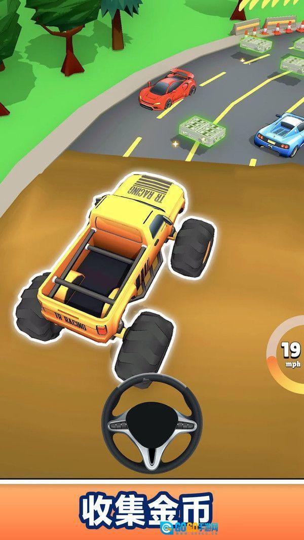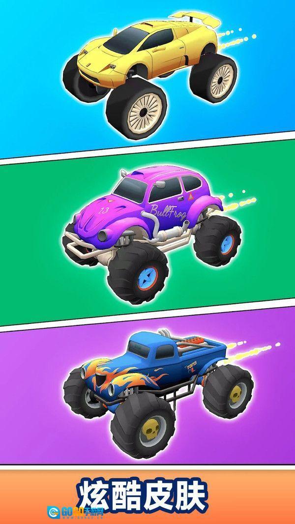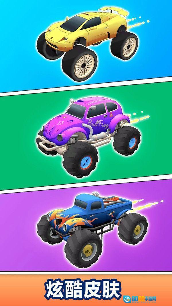 2、驾驶威猛的怪物卡车去碾压小汽车与障碍物,尽情感受破坏带来的快感。