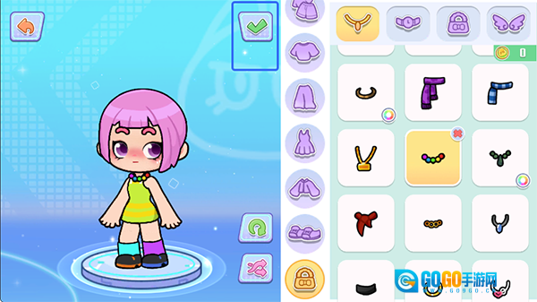 3、接下来玩家可以为角色挑选五官、服饰、帽子、眼镜、发夹、衣服、头饰之类的外观选项,创建完成后点击上方的√确认即可。
