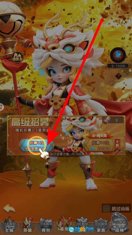 要获取新的英雄角色,需进入高级招募界面;点击招募1次时,若有免费次数则优先使用,以此获取英雄来扩充队伍,为闯关储备战力,提升阵容强度。