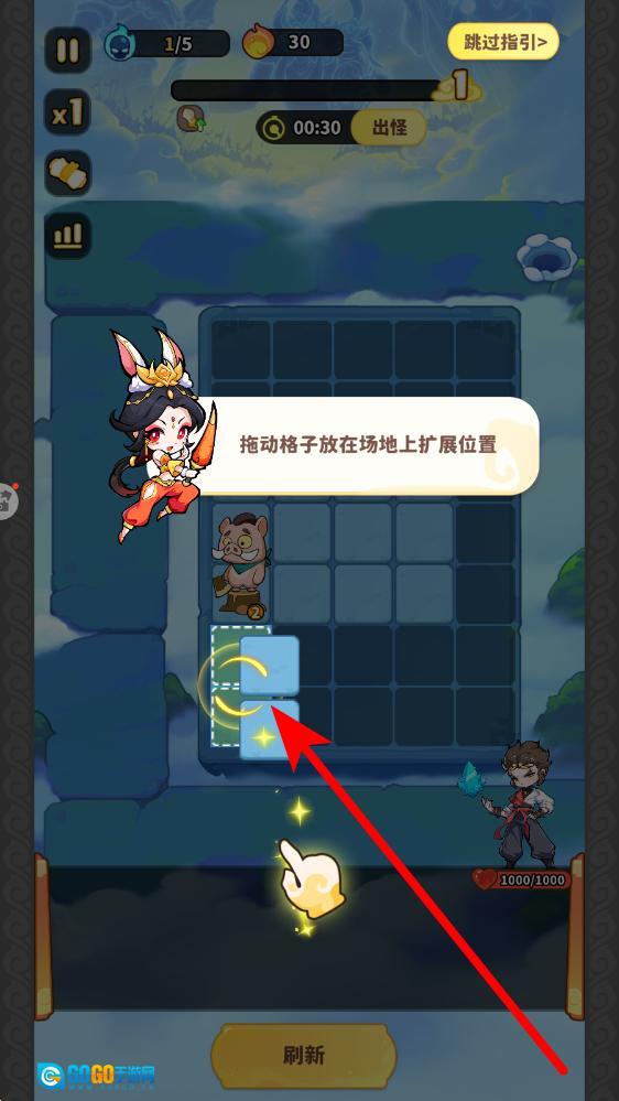 2、拓展格子时,拖动下方的蓝色格子道具,将其放置在场地的空白区域,这样就能增加可布置魔宠的有效位置;随着关卡推进,要及时扩展场地空间,从而提升阵容搭建的灵活适配性。