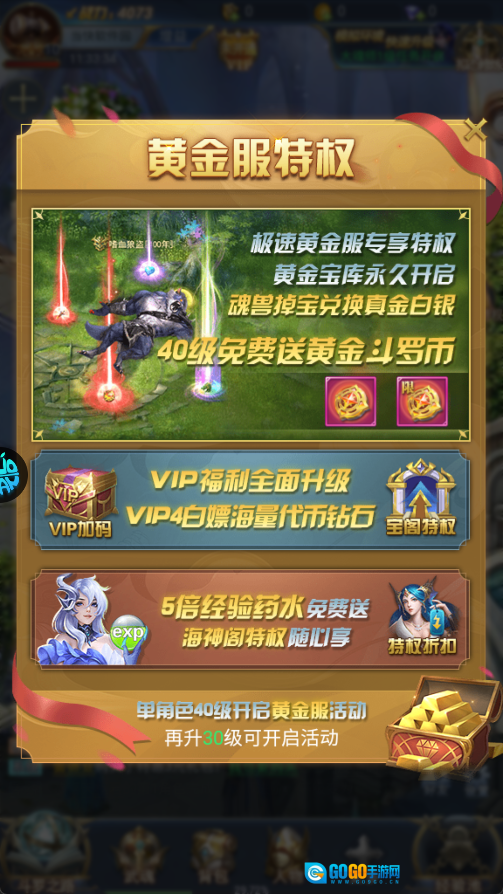 5、当单个角色达到40级时,会开启黄金服活动;之后该角色再提升30级,即可开启对应活动。