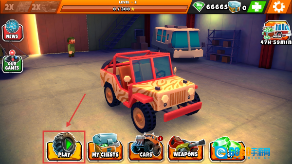 1、进入游戏车库,找到【PLAY】按钮,点击该按钮即可开启僵尸狩猎之旅,随后驾驶爱车出发战斗。