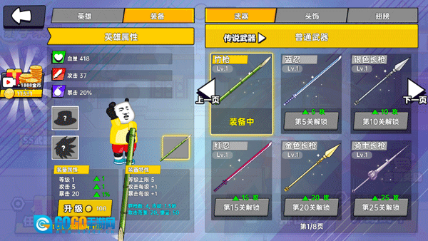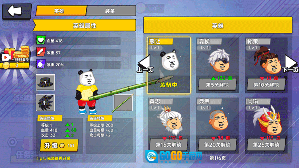 1、前期集中精力培养熊猫头,优先提升攻击和暴击属性,积攒金币购置竹枪这类基础武器,以快速通关前10关,积累资源解锁新英雄。