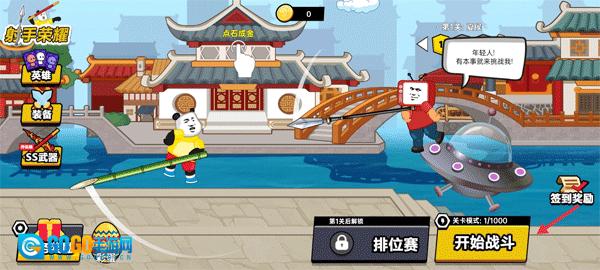 1、根据图示,选择装备,还有签到奖励后进入挑战。