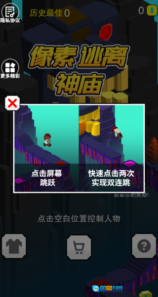 1、第一步我们要掌握基础操作,点击屏幕就能完成跳跃,只有快速点击两次才可以实现双连跳。