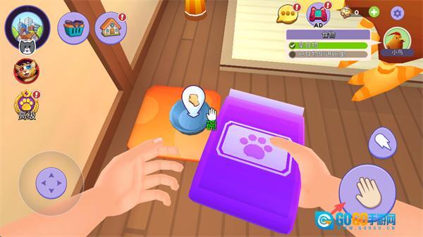 7、将镜头对准宠物的饭碗,点击屏幕右下角的小手图标,就能把食物投放进去喂养它了。