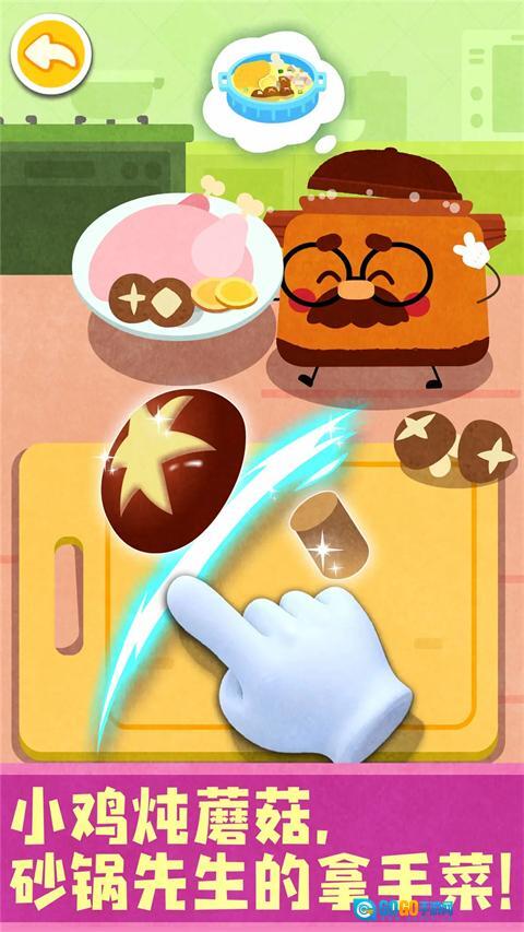 有请砂锅爷爷。瞧,它已经装好半锅水,准备烹饪小鸡炖蘑菇。小鸡扑通跳进了砂锅。宝宝来为蘑菇DIY时尚造型吧,处理完毕,砂锅爷爷要大展身手咯,它还会烹饪胡萝卜炖牛腩哦!