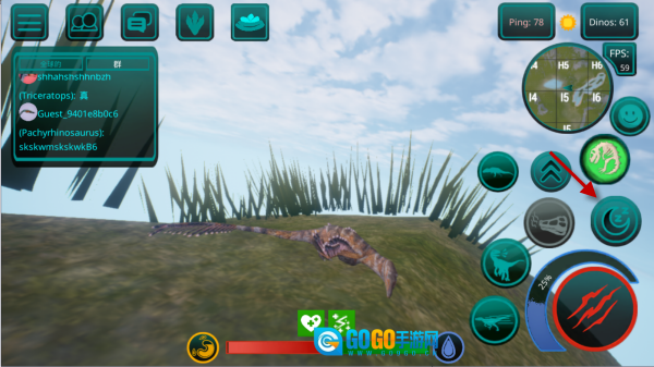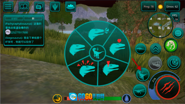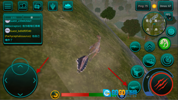2、左侧的摇杆用于操控恐龙移动,点击右侧箭头所指的按钮即可实现加速。