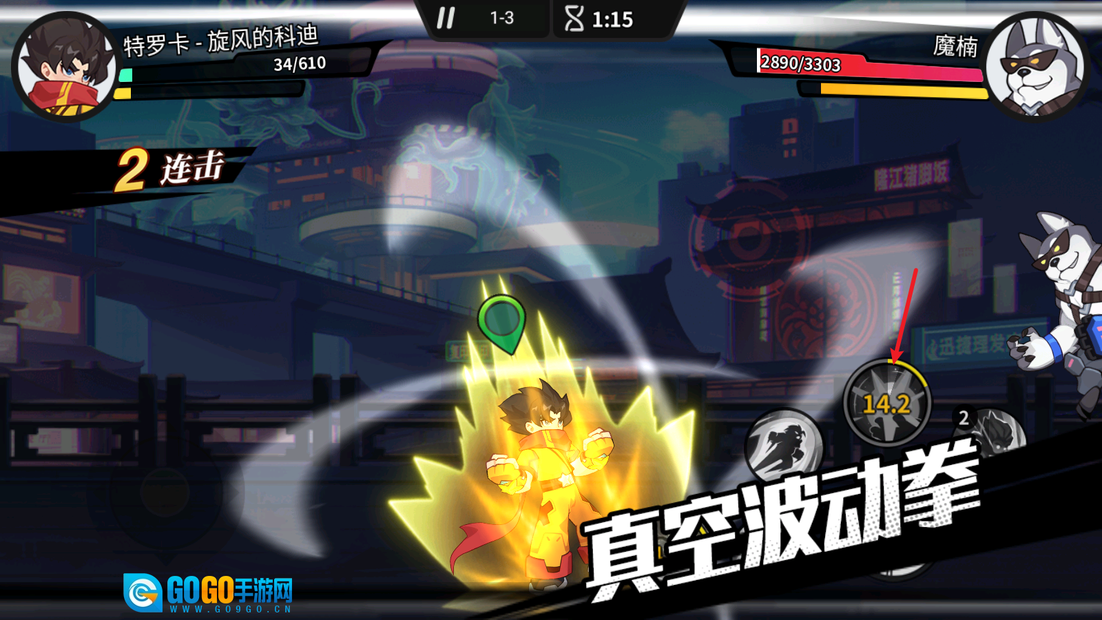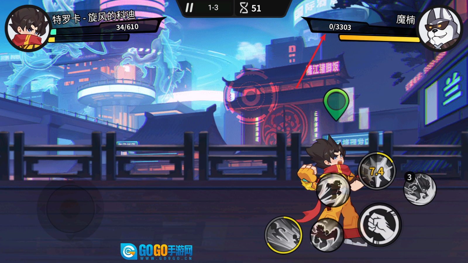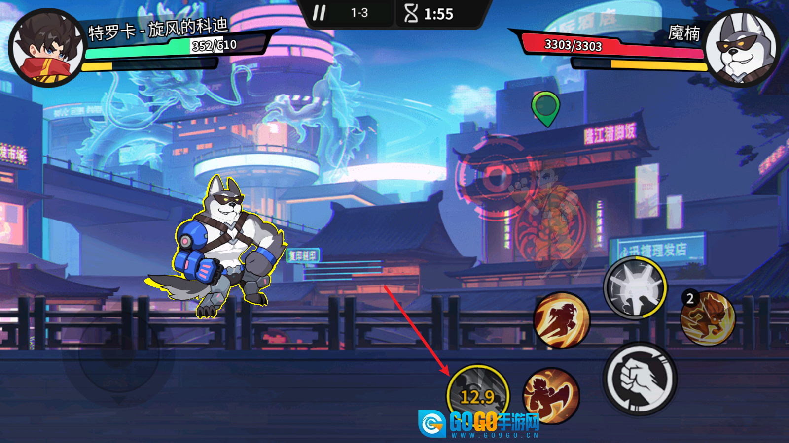 3、针对角色各自的特性,我们设计了不同的战斗方式,点击拳头图标可发动普通攻击,左侧的两个图标则对应小技能。