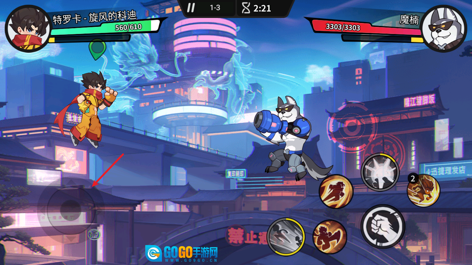 2、战斗中通过左侧的虚拟摇杆控制人物进行移动。