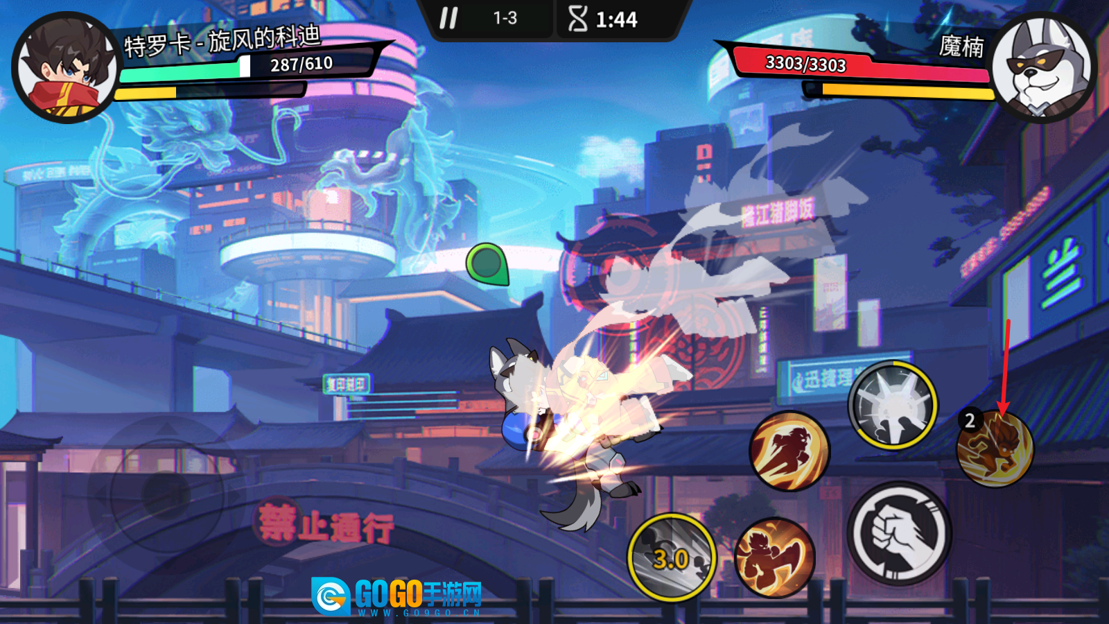 4、小技能左侧带有能量条的按键为反击键,当能量条积满后,在敌人发起攻击的瞬间使用该键,能够避开敌人的攻击并向前方进行瞬闪。