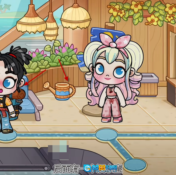 1、先抵达机场,把这个女孩挪开,就能看到一个洒水壶。