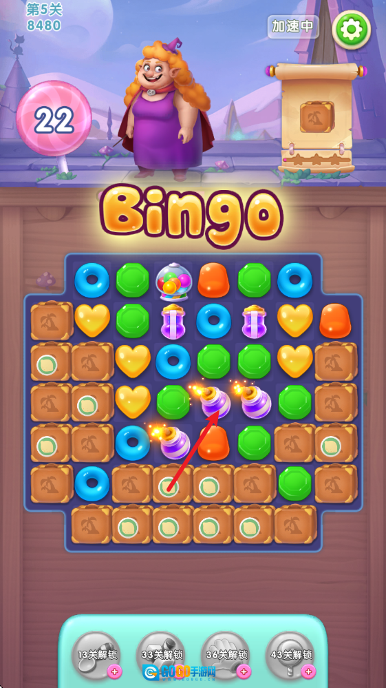 3、通过移动相邻的图案,使三个相同图案相连就能消除,当成功消除目标图案时,就会对女巫造成伤害。