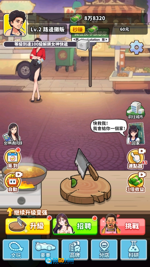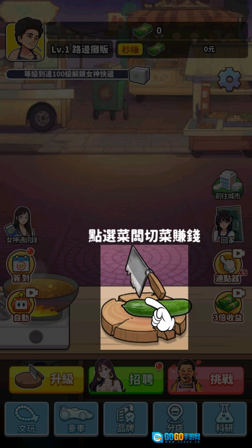 1、在游戏里我扮演食神,准备烹饪菜肴时,第一步要做的就是切菜!点击菜刀就能开始切菜操作。而且菜刀是可以升级的,升级后能更快地完成切菜步骤。