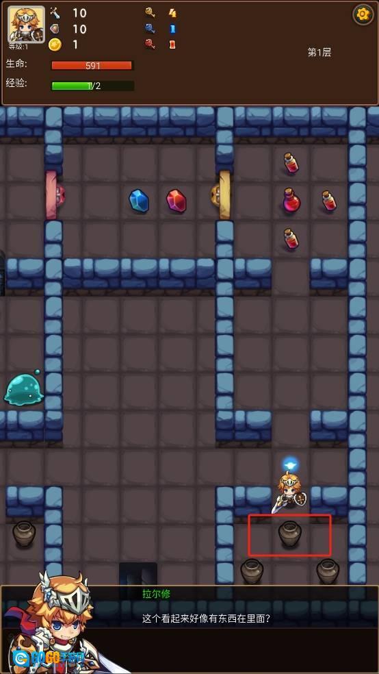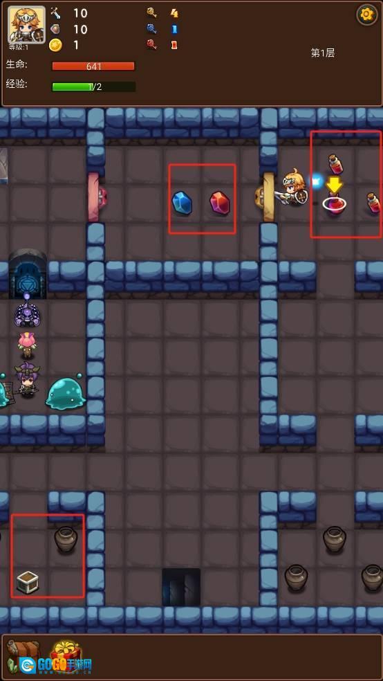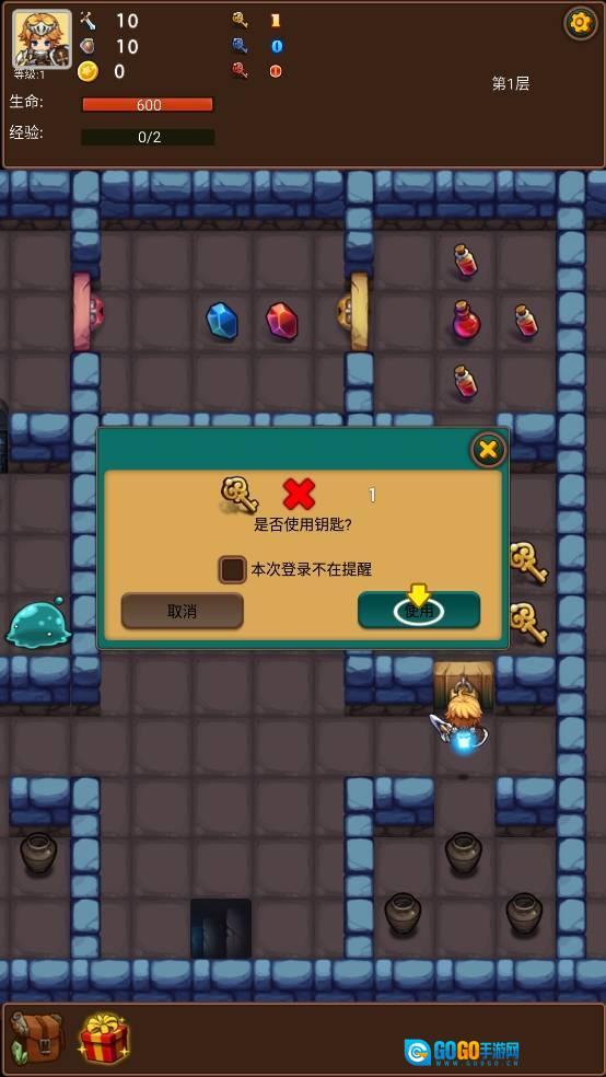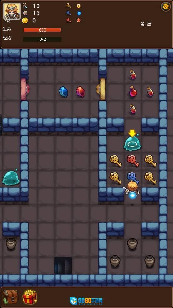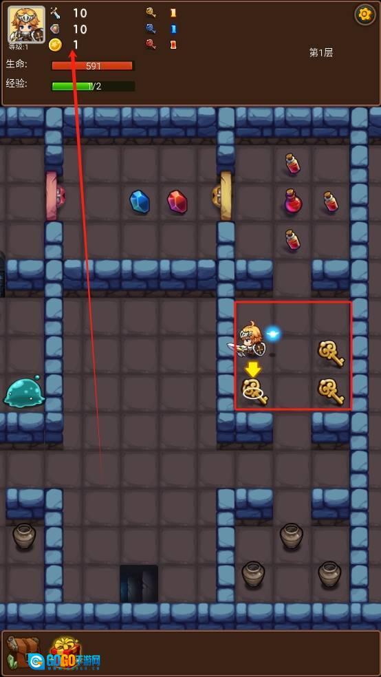 3、击败史莱姆可获取金币,记得拾起地面上的钥匙,不同颜色的钥匙对应开启不同颜色的大门。