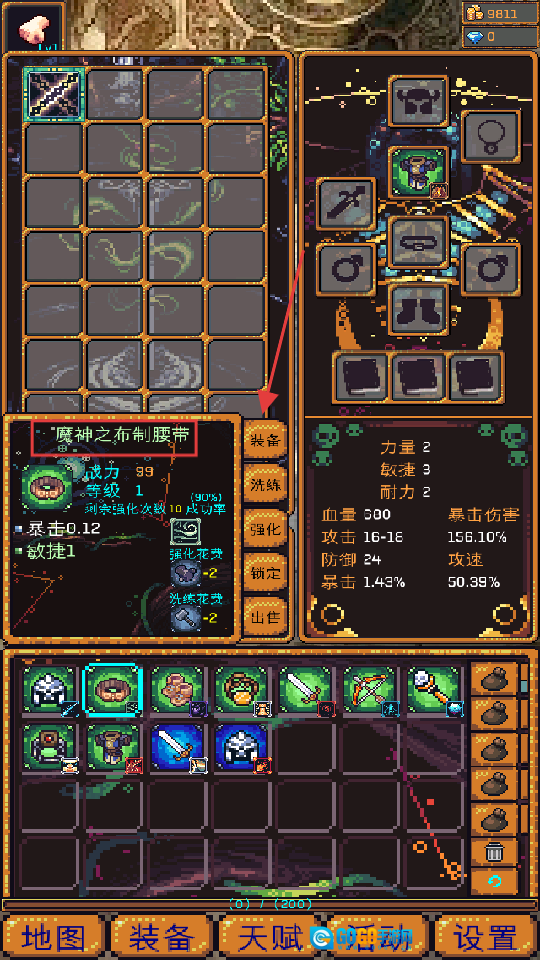 2、打开【装备】界面后,能够对装备进行强化和洗练操作。比如强化【魔神之布制腰带】,就能提升战力,为战斗提供助力。