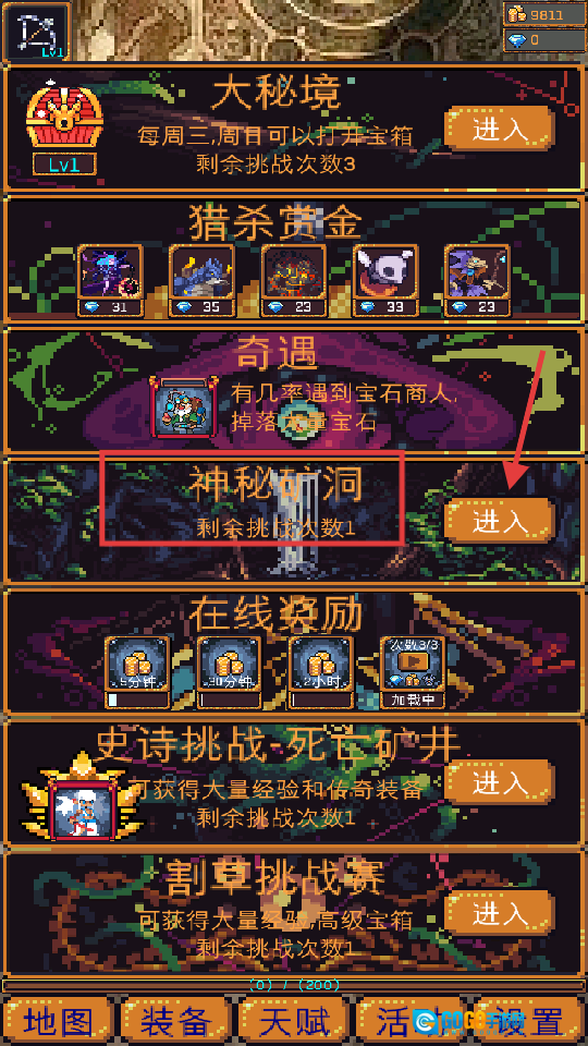3、参与【神秘矿洞】玩法,点击【进入】按钮,即可获取矿石类材料,这些材料可用于装备的强化与洗练操作,进而提升角色战力。