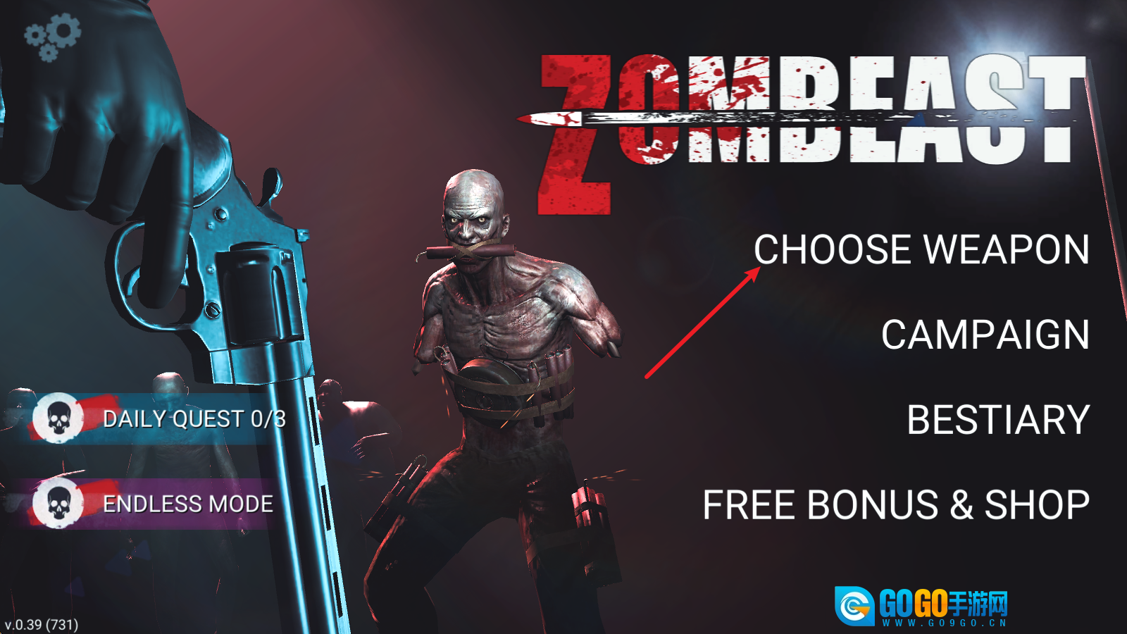 1、在主界面找到“CHOOSE WEAPON”选项并点击,即可进入武器界面。
