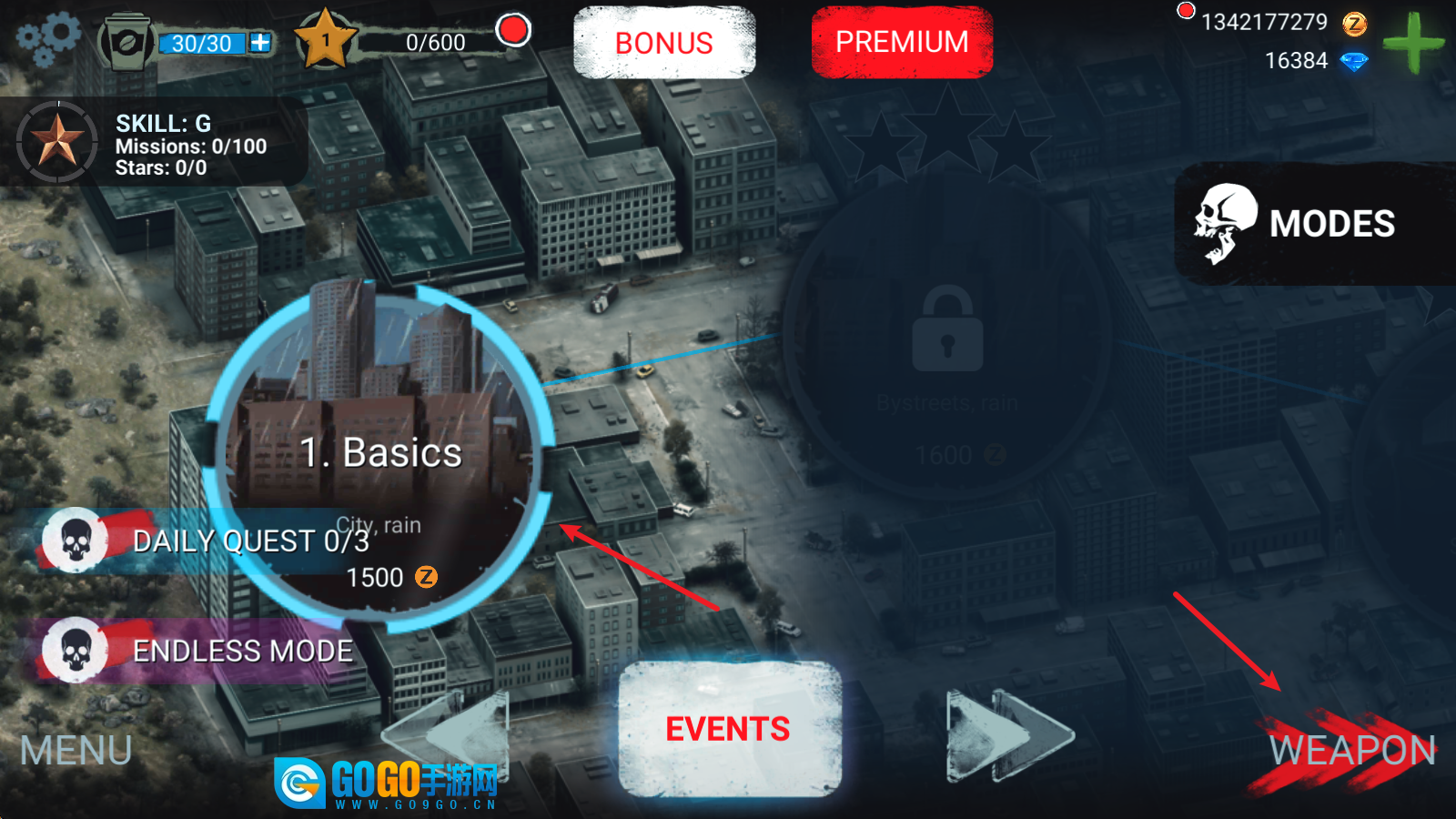 1、点击“开始游戏”后,我们选择关卡开启挑战,点击右下角的WEAPON按钮还能进行武器配置。