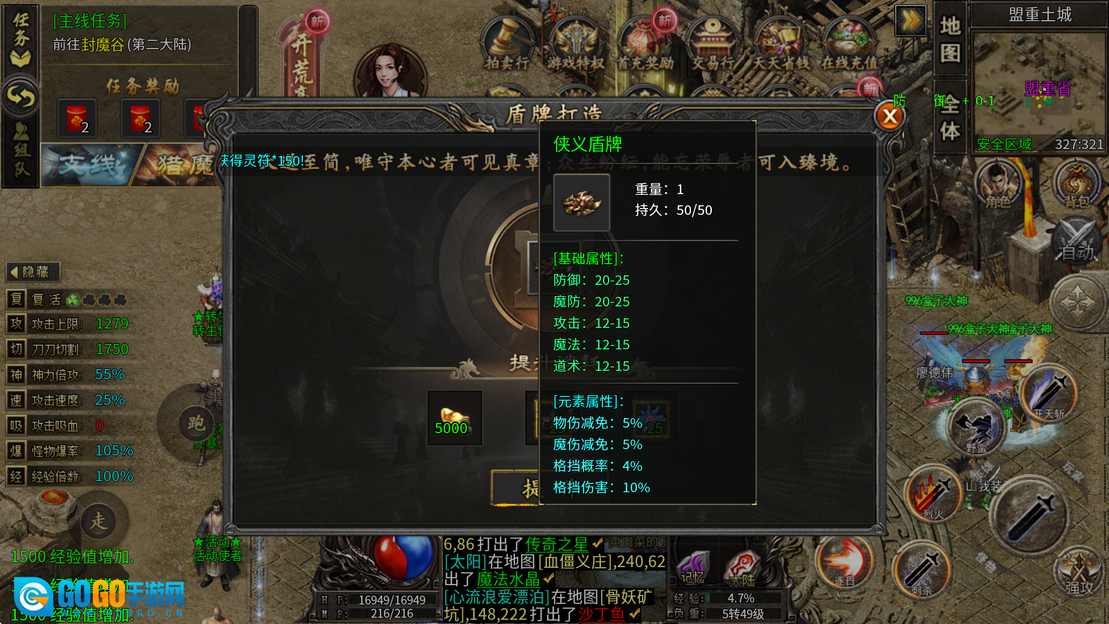 5、盾牌锻造:通过消耗元宝、传奇之星与修炼水晶来提升等级,每提升一级都能获得攻魔道和防御属性加成,同时还可增加格挡效果、物理伤害减免以及魔法伤害减免属性。