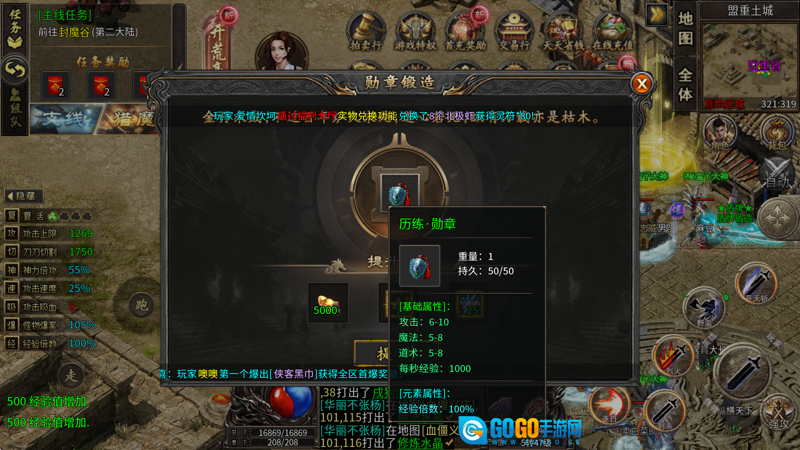 2、勋章锻造:通过消耗元宝、传奇之星与修炼水晶来提升等级,每提升一级不仅能获得攻魔道属性加成,还会提供经验倍数加成。