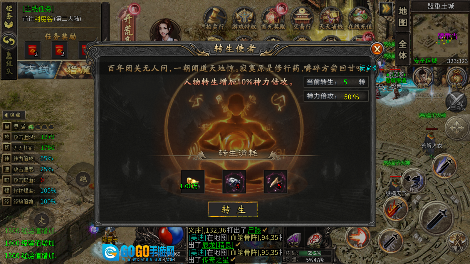 3、转生使者:消耗元宝和每一级对应的转生材料来提升等级,每次转生都能获得10%的神力倍攻加成。