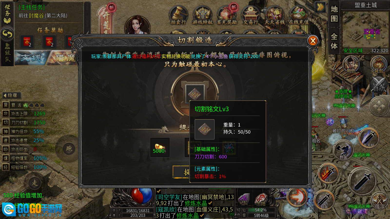 1、切割铭文:通过消耗元宝、传奇之星与修炼水晶来提升等级,每提升一级不仅能增加切割伤害,还可提高切割暴击概率。
