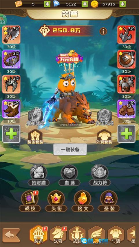 3、进入主角板块,你可以在此更换装备,对主角的战技、铭文、战骑进行升级与操作