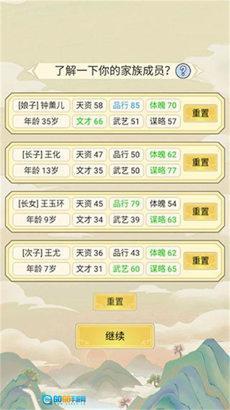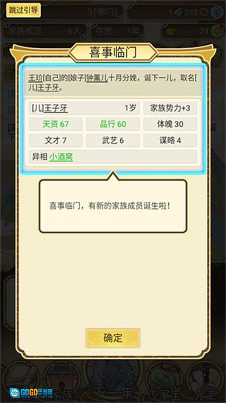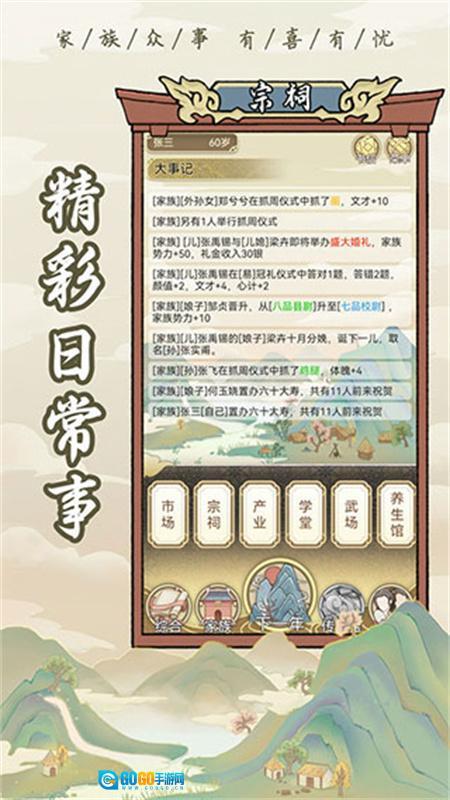 3、处理家事 —— 从成年家人的仕途沉浮与生死大事,到孩童抓周、考试等日常小事,家族中会不断出现各类随机事件等待你去应对,而你做出的每一个选择,都将对家族未来的发展走向产生影响。