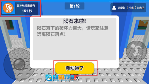 1、完成“陨石来袭”的新手引导流程,在点击“我知道了”后,迅速移动到距离自己最近的建筑后方,借此熟悉摇杆与跳跃按键的操控节奏。