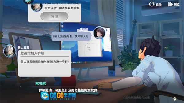 打开游戏后,你会收到一个名为黄山真君的人发送的好友请求,他还会邀请你加入九州一号群。记得点击同意哦!
