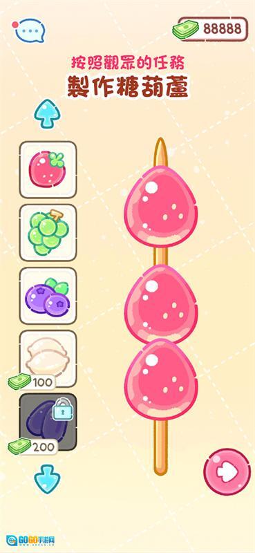 在糖葫芦达人这款游戏里,玩法十分简单,很容易上手。你只需点击屏幕,就能制作各式各样的糖葫芦。记得要运用各类新奇独特的材料来创作,可别仅仅局限于水果哟。