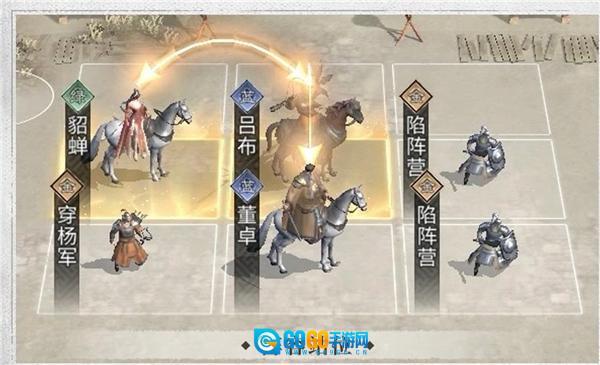 吕布和貂蝉互相踩对方的追击格,同时吕布也踩中董卓提供的追击格;另外可以用生存能力较强的盾兵来吸收部分伤害,如果董卓的养成度足够高,还能上阵更多输出兵种来提升多穿能力。