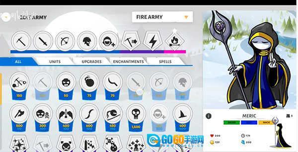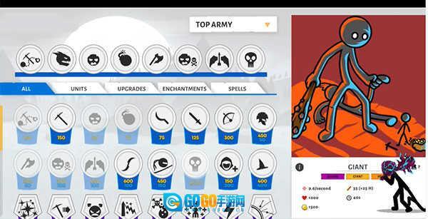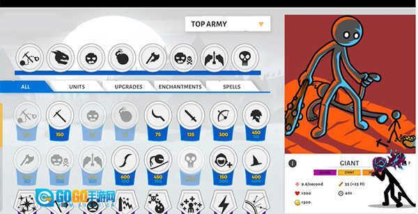 2.玩家能够操控每一个火柴人,进行黄金开采,对已有的兵种进行排兵布阵,摧毁敌人阵营的雕像。